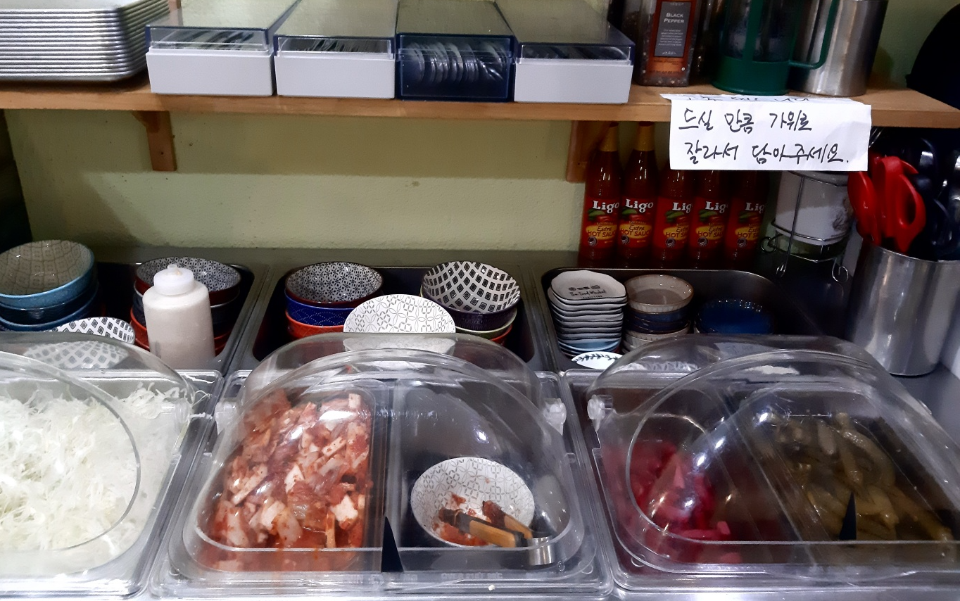 셀프 코너입니다. 김치, 양배추, 무피클, 고추피클등이 있어요.