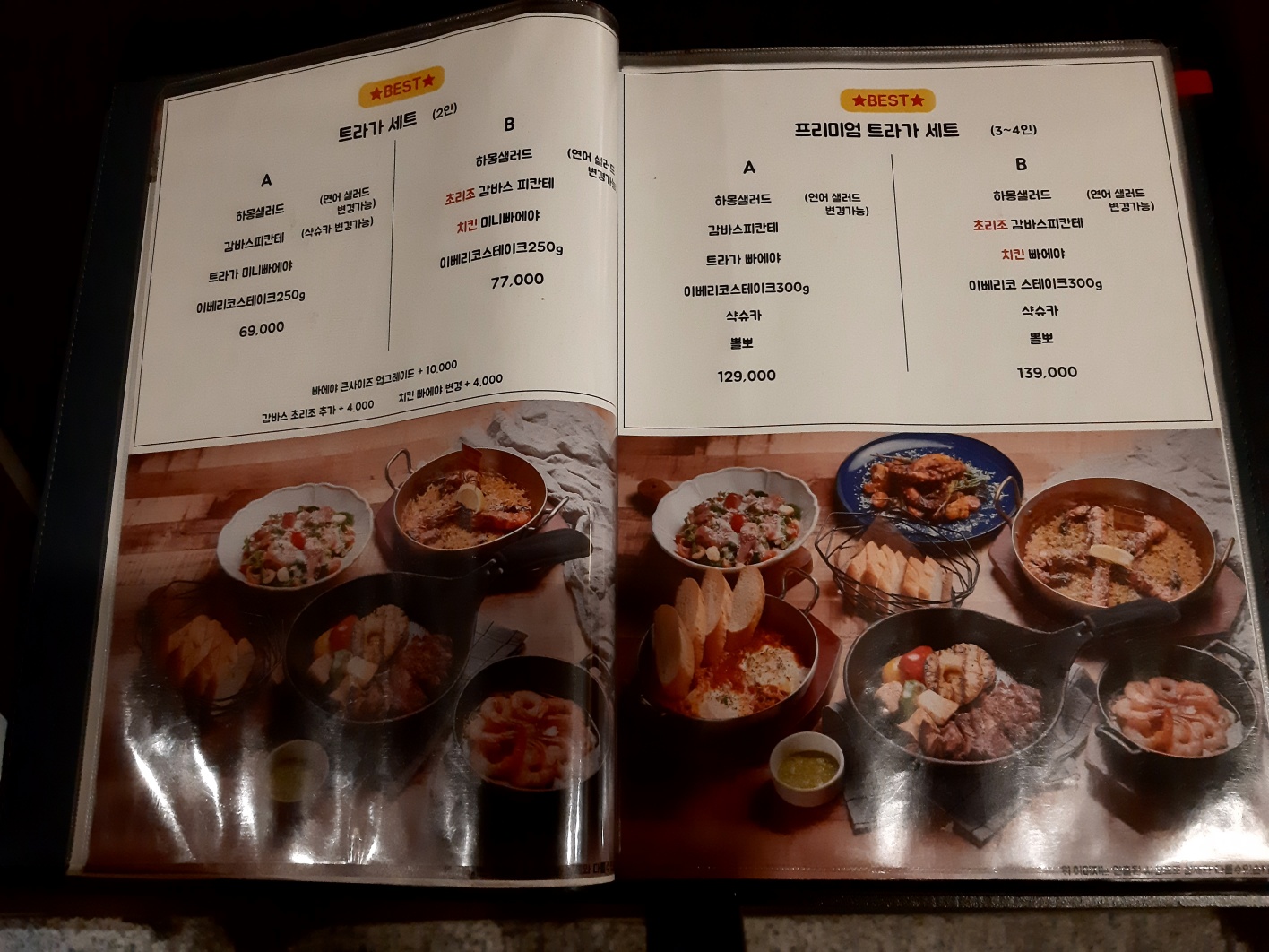 대표 메뉴로는 하몽 샐러드, 감바스 피칸테, 빠에야, 이베리코 스테이크, 샥슈카, 세비체등이 있으며, 세트 메뉴인 2인 트라가 세트와 3~4인 프리미엄 세트가 있습니다. 우리는 2인 세트를 주문했습니다. 와인을 마시고 싶었지만 몸이 음주를 할 상태는 아니어서 음료는 콜라로 만족하기로 했어요.