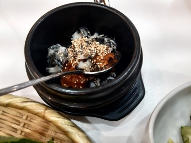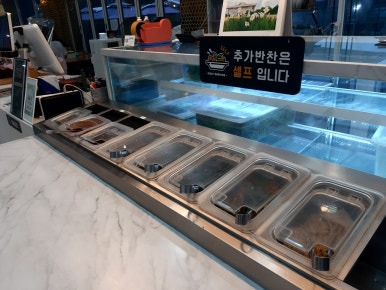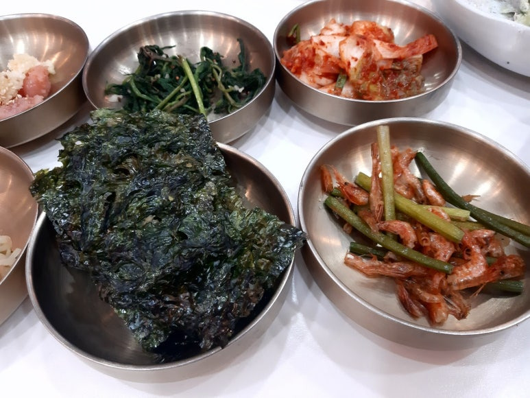 반찬 종류 많지요.~~멸치, 새우, 오이무침, 숙주나물, 깻잎무침, 김치 ,곱창김,명란 젓, 고추장, 간장, 갈치?젓갈,글리고 된장찌개. 젓갈은 처음에 고추장인줄 알고 안 먹다가 조금 먹었고요, 깻잎무침과 김이 맛있었고, 마늘 다져서 버무려먹는 명란 젓도 그리 짜지 않고 맛있었어요. 우렁된장 찌개도 맛이었고요.