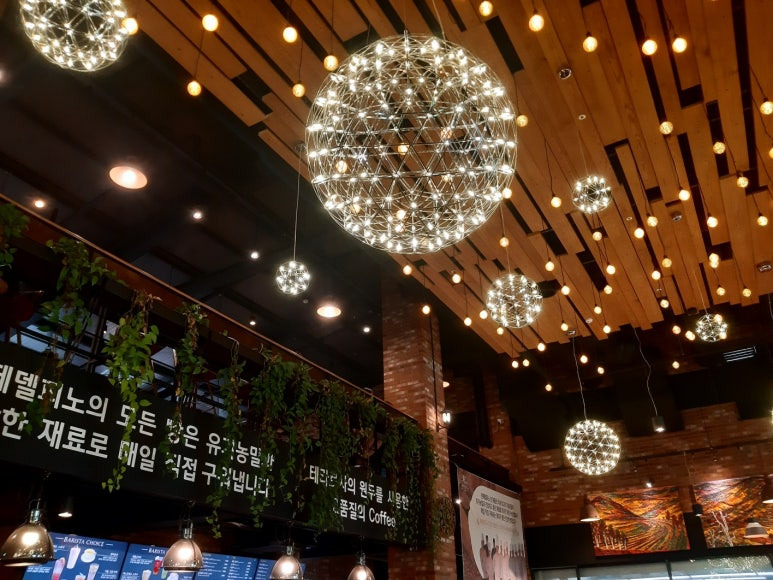요즘 대형카페들이 많이 생기고 있는데요, 이 곳도 다른 곳 못지않게 넓은 공간을 자랑하고 있어요. 1층과 2층으로 되어 있고, 1층은 천장고 높고 통창의 개방형이라면 2층은 아늑한 옛 감성 충만한 음악다방 느낌이 었어요. 2층은 거실 쇼파처럼 커다란 쇼파들이 배치되어 있었는데, 누워 계신분들도 있고, 눈을 감고 계신분도 있었구요~, 정말 편하게 쉴 수 있는 장소처럼 느껴졌어요. 오후에는 저기 무대에서공연도 한답니다.